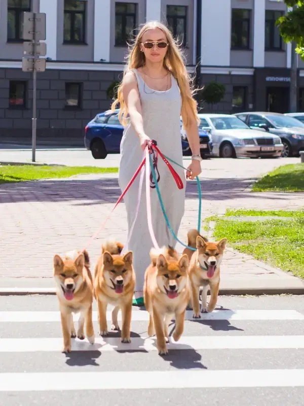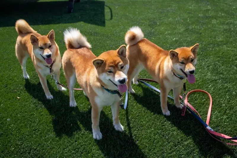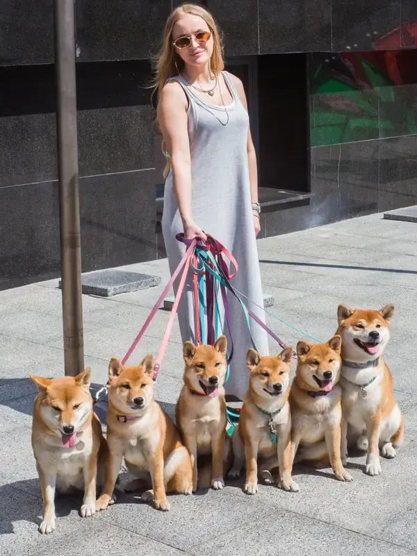 A row of Shibas, demonstrating the red, white, aw-type sesame, and black & tan colour, together on a Shiba walk.
